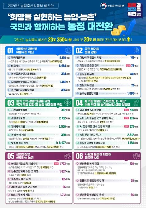 [종합뉴스채널, 김기훈기자] 농림축산식품부는 2026년 예산안을 전년 대비 6.9%(1조 2,934억원) 증가한 20조 350억원 규모로 편성했다고 밝혔다.