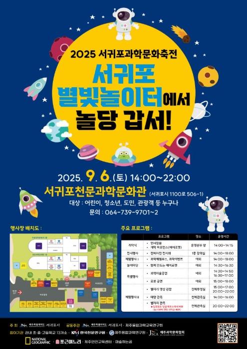 [종합뉴스채널, 최한수기자] 서귀포시는 '2025 서귀포과학문화축전'을 오는 9월 6일 14시부터 22시까지 서귀포천문과학문화관(서귀포시 1100로 506-1)에서 개최한다.