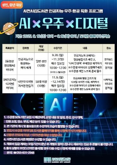 성인·중년 프로그램은 동영상 생성형 AI를 활용한 '인공지능으로 확장하는 책의 세계', AI와 협업 글쓰기를 통한 '나만의 디지털 자서전 만들기' 등 총 2개 강좌다.