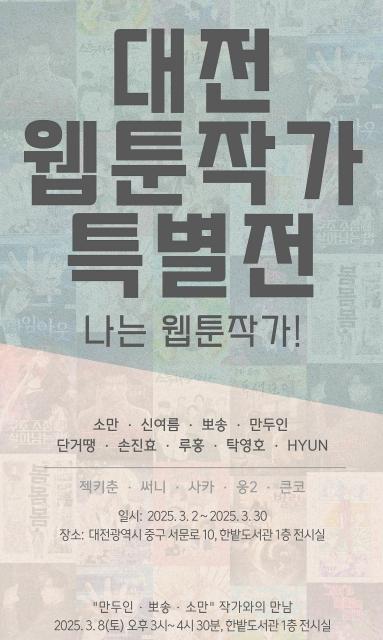 대전한밭도서관은 3월 2일부터 3월 30일까지 본관 1층 전시실에서‘대전 웹툰작가 특별전: 나는 웹툰작가!’를 개최한다.