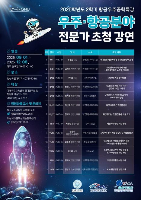 관심 있는 사람은 경상국립대학교 항공우주시스템연구소 누리집에서 자세한 일정과 강연 주제, 초청 강사를 확인하면 된다.