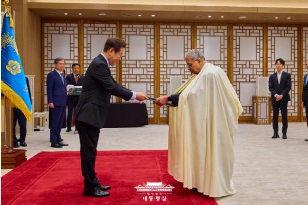 [종합뉴스채널, 박광덕기자] 이재명 대통령은 오늘 오후 대통령실에서 개최된 신임장 제정식에서 신임 주한 상주대사 7명으로부터 신임장을 제출받았다. 신임장 제정식은 파견국의 국가원수가 자국의 신임 대사에게 수여한 신임장을 주재국 국가원수에게 전달하는 절차로, 이번 제정식은 우리 신정부 출범 이후 처음 개최된 것이다.