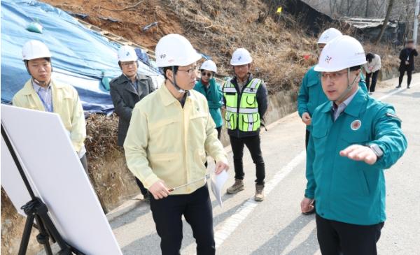 먼저, 지난 2월 낙석방지망과 울타리 등 급경사지 안전시설 설치가 완료된 세천체육공원을 방문해 준공 현장을 점검헀으며, 이어 내년 5월 준공 예정인 대청호수길 선형개량사업 공사 현장과 지난해 12월 준공된 효평동 산39-7번지 급경사지 보강공사 현장을 찾아 전반적인 안전 점검을 실시했다.