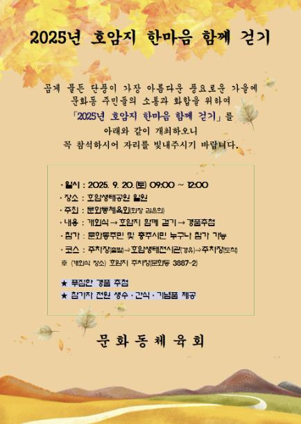 [종합뉴스채널, 김현성기자] 충주시 문화동 행정복지센터는 시민 산책의 명소 호암생태공원 일원에서 오는 20일 ‘2025년 문화동 한마음 체육행사 - 호암지 한마음 함께 걷기’ 행사를 개최한다고 밝혔다.