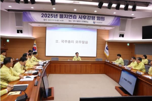 [종합뉴스채널, 박광덕기자] 김민석 국무총리는 9월 12일 오후 정부서울청사에서 중앙행정기관장, 시·도지사 등 150명이 참석한 가운데 2025년 을지연습 사후강평회의를 주재했다.