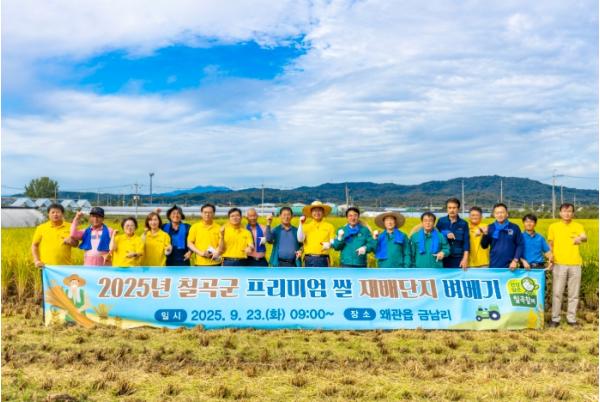 [종합뉴스채널, 신철훈기자] 칠곡군은 23일 왜관읍 금남리에서 ‘칠곡군 프리미엄 쌀 재배단지 벼베기 행사’를 개최했다.