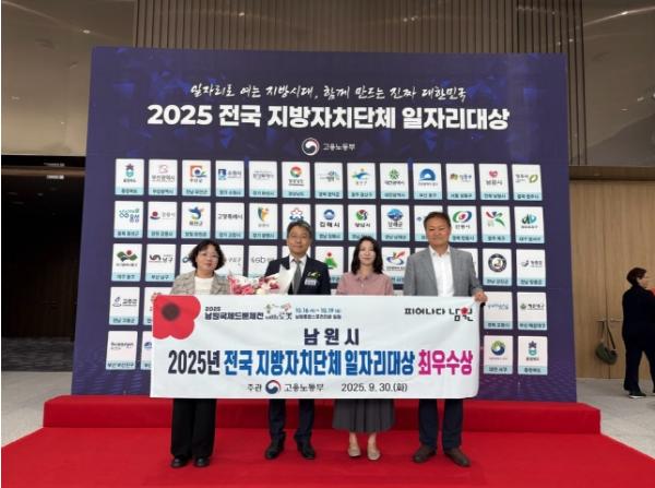 [종합뉴스채널, 홍희주기자] 남원시는 9월 30일 고용노동부 주관으로 청주 오스코에서 열린 ‘2025년 전국 지방자치단체 일자리대상’에서 최우수상을 수상했다고 밝혔다.