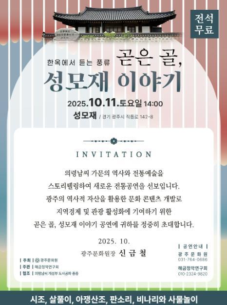 올해 하반기는 의령남씨 일가 약천 남구만을 주제로 한 “한옥에서 듣는 풍류 곧은골, 성모재 이야기” 공연으로 시민들의 곁을 찾아갈 예정이다.