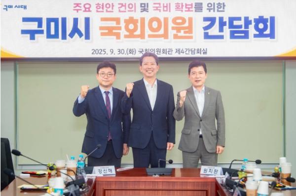[종합뉴스채널, 김기훈기자] 구미시는 9월 30일 국회를 방문해 구자근, 강명구 지역구 국회의원과 간담회를 열고 지역 주요 현안과 국비 확보 전략을 논의했다. 이날 간담회에는 김장호 시장을 비롯해 구미시 주요 간부 공무원 등 30여 명이 참석했다. 시는 현안 사업 추진 상황과 정부 예산 동향을 공유하며 국회 차원의 전략적 지원 방안을 모색했다.