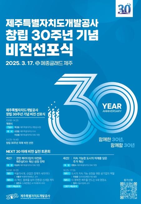이번 행사는 제주개발공사가 걸어온 30년의 여정을 돌아보고, 앞으로 나아갈 방향을 제시하는 자리로써 오영훈 제주특별자치도지사, 이상봉 제주도의회 의장을 비롯한 협력업체, 공사 임직원, 도민 등 500여 명이 참석할 예정이다.