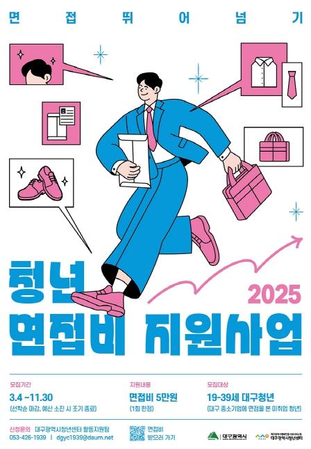 지원 자격은 19~39세 미취업 청년이며, 대구 소재 기업의 면접에 참여한 증빙서류를 갖춰 신청하면 검토 후 승인 과정을 거쳐 지원금을 지급한다.