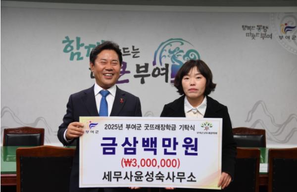세무사윤성숙사무소(대표 윤성숙)는 지난 3일 부여군청을 방문하여 인재 육성을 위한 장학금 3백만 원을 (재)부여군굿뜨래장학회에 기탁했다.