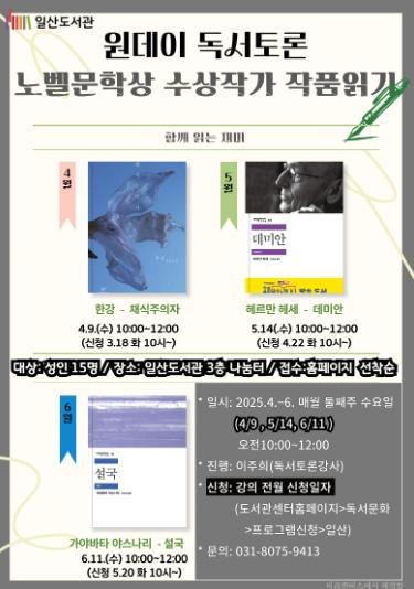 [종합뉴스채널, 발행인기자] 고양특례시 일산도서관은 오는 4월 9일 수요일부터 10월까지 매월 1회 성인 15명을 대상으로 원데이 독서토론 ’노벨문학상 수상작가 작품읽기’ 프로그램을 진행한다고 밝혔다.