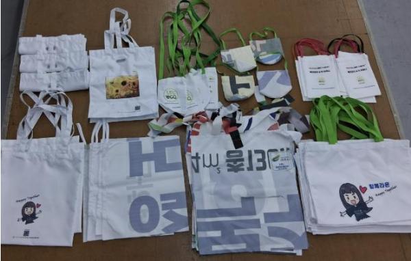 “폐현수막 재활용 사업”추진으로는 지역 내 폐현수막을 수거하고 이를 원료로 가공해 에코백, 마대자루 15,000장을 제작하고 관내 읍·면·동행정복지센터 등 필요한 곳에 우선 보급했다.