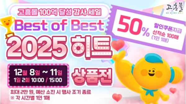 [종합뉴스채널, 신철훈기자] 고흥군은 직영 온라인 농수축특산물 쇼핑몰 ‘고흥몰’이 누적 매출 100억 원 돌파를 기념해 오는 1월 8일부터 11일까지 ‘100억 달성 감사 세일–2025 Best of Best’ 기획전을 진행한다고 밝혔다.