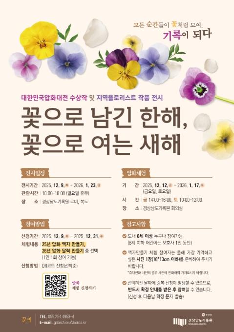 전시기간에는 도민이 직접 참여할 수 있는 압화 체험 프로그램도 진행된다. 12월에는 ‘나만의 압화 액자 만들기’, 2026년 1월에는 ‘새해 압화 달력 제작’이 진행되며, 참가자는 자신만의 이야기를 꽃으로 표현하는 경험을 할 수 있고, 완성된 작품은 개인의 순간을 담아내는 특별한 기록물로 남는다.