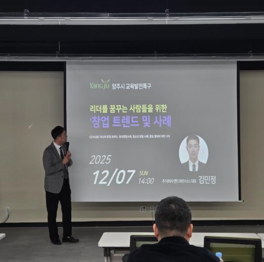시는 지난 7일, 양주교육지원센터 회의실(옥정동 드림타워 210호)에서 ‘리더를 꿈꾸는 사람들을 위한 창업 트렌드 및 사례’ 특강을 열고 지역 청소년들에게 국내외 최신 창업 흐름과 실제 창업사례를 전달했다.