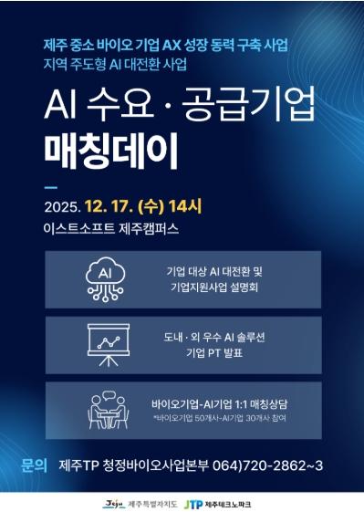 [종합뉴스채널, 신철훈기자] 제주특별자치도와 제주테크노파크는 17일 오후 2시 첨단과기단지 내 이스트소프트 제주캠퍼스에서 ‘제주 바이오기업 인공지능 전환(AX)을 위한 인공지능(AI) 수요·공급 매칭 행사’를 개최한다.