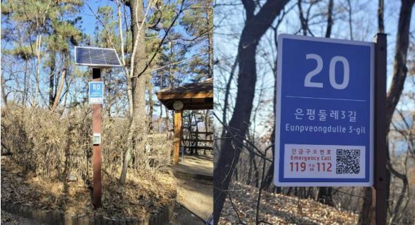 은평구는 지난달 ‘스마트한 은평둘레길 기초번호판 설치 사업’을 완료했다. 산악 지형이 많은 은평둘레길에서 도로명주소가 없고 휴대전화 배터리 방전으로 연락이 끊기는 상황이 발생해 구조 활동의 황금 시간을 놓칠 수 있다는 점에 착안해, 구민 안전을 최우선으로 확보하기 위해 추진됐다.