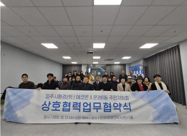 [종합뉴스채널, 최한솔기자] 운정6동 주민자치회는 12월 17일 오전 10시, 운정6동 행정복지센터에서 파주시환경센터 ‘에코온’과 ‘지역 환경 의제 실천 및 기후행동 협력을 위한 업무협약’을 체결하고, 이어 마을 소식지 '초롱꽃향기로' 2호 제작 성과공유회를 개최했다.