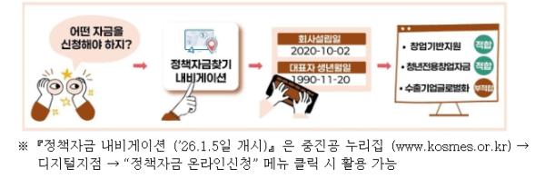 먼저, 기업의 정책자금 신청부담을 완화하기 위해 ‘정책자금 내비게이션’을 신규 도입한다. 정책자금 내비게이션은 기업이 자금 신청 시, 업력·폐업여부·수출실적·자금용도 등 기초정보를 입력하면 내비게이터가 해당 정보를 토대로 맞춤형 적합자금을 추천해주는 시스템으로, 어떤 자금이 기업에게 적합한지 알려주는 길잡이 역할을 할 것으로 기대된다.