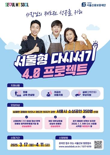 서울시와 서울신용보증재단이 과거 사업 실패 경험이 있는 소상공인의 재기를 돕는 ‘서울형 다시서기 4.0 프로젝트’를 오는 17일부터 실시한다. ‘서울형 다시서기 4.0 프로젝트’는 재도전 특화교육부터 전문가의 1:1 경영 컨설팅, 최대 200만 원의 사업초기 자금, 저금리 대출 보증과 보증료 일부 지원까지 사업 재기에 필요한 금융·비금융 서비스를 ‘패키지’로 지원한다.