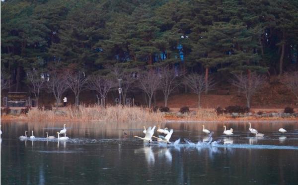한겨울, 물살을 가르며 비상하는 고니의 모습이 고요한 연호공원에 생동감을 더하며 대한민국의 숨결을 고스란히 전하고 있다.