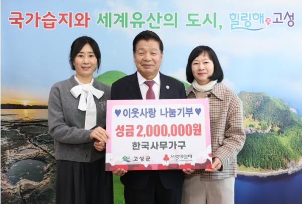 [종합뉴스채널, 김현성기자] 고성군 대독리 소재 한국사무가구 김현주 부사장은 1월 6일, 고성군청을 방문하여 관내 어려운 이웃을 위해 써 달라며 이웃돕기성금 200만 원을 전달했다.