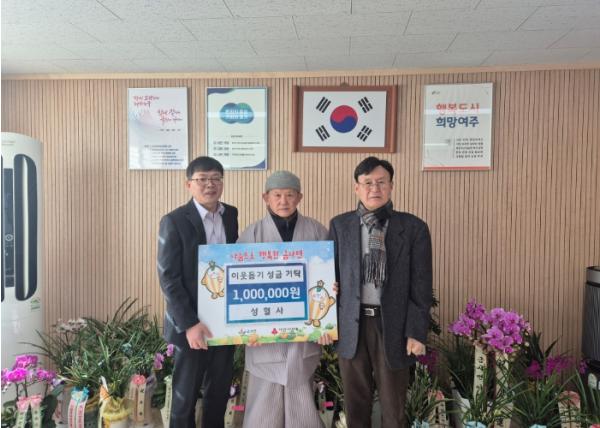 지난 6일 성혈사는 금사면행정복지센터(면장 신지철)를 방문하여 사랑의 이웃돕기 성금 100만 원을 기탁했다. 성혈사는 매년 초 소외된 이웃을 위한 성금을 꾸준히 전달하며 지역사회의 귀감이 되고 있다.