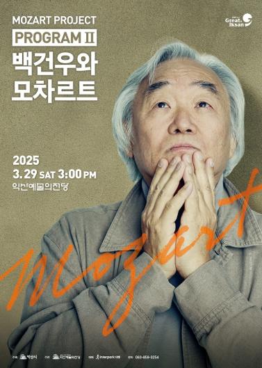 익산시는 '백건우와 모차르트' 공연이 3월 29일 오후 3시 익산예술의전당 대공연장에서펼쳐진다고 20일 밝혔다.