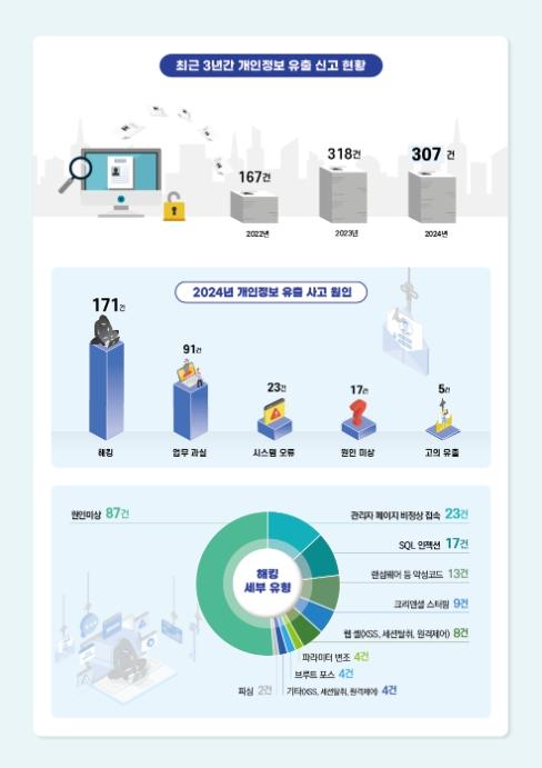보고서에 따르면 2024년 접수한 유출 신고 건은 총 307건이었다. 전년도 318건과 비슷한 수준이다. 유출 원인은 해킹이 56%(171건)로 가장 높은 비중을 차지했으며, 업무 과실 30%(91건), 시스템 오류 7%(23건) 순으로 나타났다. 전년도에 비해 해킹은 증가(151건 → 171건)한 반면, 업무 과실(116건 → 91건) 및 시스템 오류(29건 → 23건)로 인한 유출은 감소했다.