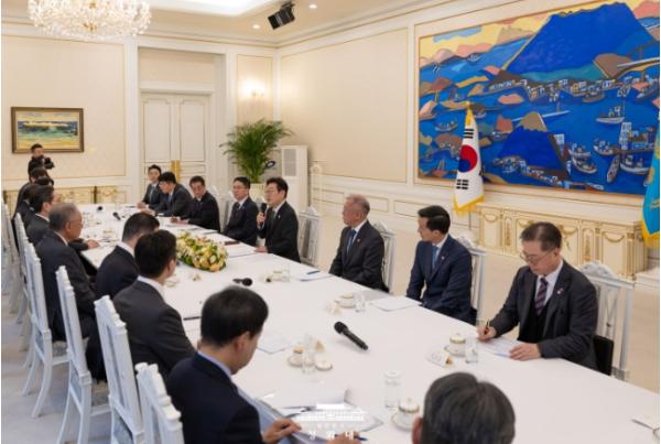 이 대통령은 이날 오후 청와대에서 열린 '청년 일자리와 지방투자 확대를 위한 기업간담회'를 갖고 이 같이 말했다. 이날 간담회에는 류진 한경협 회장과 함께 삼성 이재용 회장, SK 최창원 부회장, 현대차 정의선 회장, LG 구광모 회장, 롯데 신동빈 회장, 포스코 장인화 회장, 한화 김동관 부회장, HD 현대 정기선 회장, GS 허태수 회장, 한진 조원태 회장 등 10명의 기업인이 참석했다.