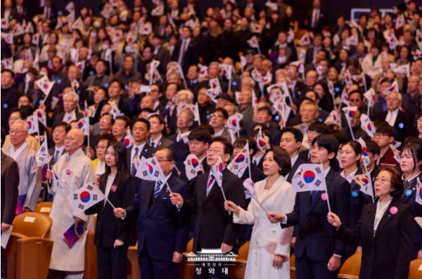 이 대통령은 "우리 선열들의 3·1혁명 정신은 오늘날 우리를 비롯한 전 세계인들에게 크나큰 가르침을 주고 있다"며 "3·1혁명은 독립선언이자 평화 선언이었으며, 우리가 나아갈 평화와 공존의 미래를 제시한 나침반이었다"고 강조했다.