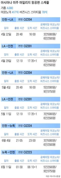 마일리지 전용기는 월 2편씩 모두 6편이다. 4월과 5월에는 인천∼로스앤젤레스(LA) 노선, 6월엔 인천∼뉴욕 노선에 투입한다. 잔여석 1870석 모두 마일리지로만 예약할 수 있다. 다만 출발일 20일 전부터는 판매되지 않은 좌석을 유상으로도 구매할 수 있다. 마일리지 전용기는 총 495석 규모의 초대형 항공기인 A380이 투입된다.