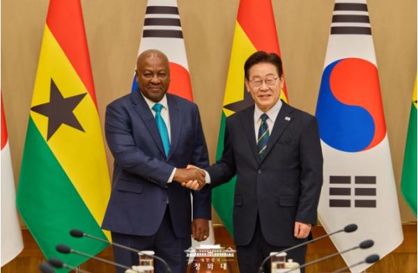 [종합뉴스채널, 김기훈기자] 이재명 대통령은 11일 오후 우리나라를 실무 방한한 존 드라마니 마하마 가나 대통령과 정상회담을 가졌다고 강유정 청와대 대변인이 서면 브리핑을 통해 밝혔다.