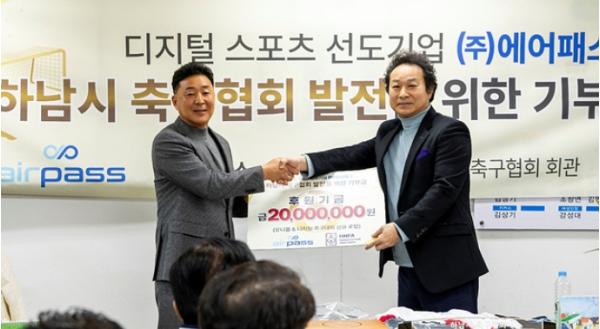 [종합뉴스채널, 최한솔기자] 디지털 스포츠 솔루션 선도기업 ㈜에어패스가 하남시 체육 발전의 근간을 마련하고 지역사회와의 실질적인 상생을 실천하기 위해 하남시 축구협회에 후원기금을 전달했다고 밝혔다.