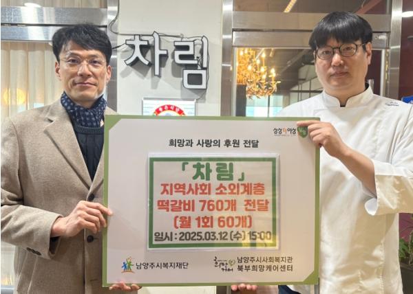 [종합뉴스채널, 최한솔기자] 남양주시는 지난 12일, 별내동에 소재한 한정식집 ‘차림’이 북부희망케어센터에 떡갈비 760개를 전달하며 정기 후원을 약정했다고 21일 밝혔다.