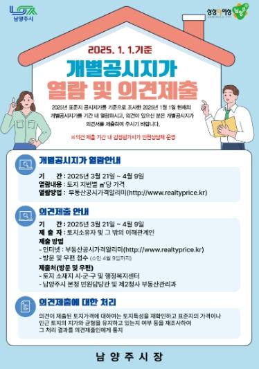 [종합뉴스채널, 최한솔기자] 남양주시는 개별공시지가에 대한 신뢰도를 높이기 위해 의견제출(3월 21일부터 4월 9일까지) 및 이의신청 기간(4월 30일부터 5월 29일까지) ‘감정평가사 민원 상담제’를 운영한다.