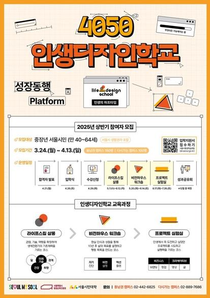서울시평생교육진흥원이 운영하는 서울시민대학이 중장년층의 새로운 인생 설계를 지원하는 ‘인생디자인학교’ 참가자를 모집한다. 모집 기간은 3월 24일부터 4월 13일까지로, 만 40~64세 중장년층을 대상으로 한다.