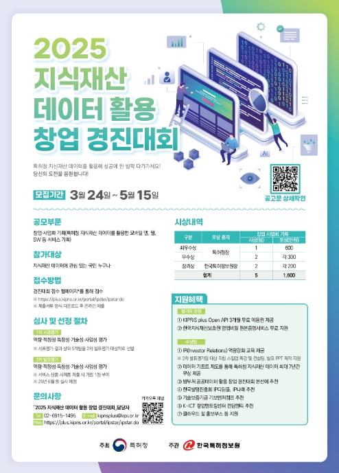 [종합뉴스채널, 발행인기자] 특허청은 특허·상표·디자인 같은 지식재산 데이터를 활용해 창의적인 사업 아이디어를 발굴하고 창업 활성화를 위해 3월 24일~5월 15일까지 ‘2025년 지식재산 데이터 활용 창업경진대회’ 참가자를 모집한다고 밝혔다.