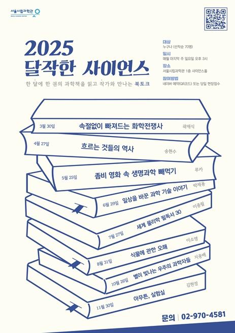 [종합뉴스채널, 최한수기자] 서울시립과학관이 오는 3월 30일부터 11월 30일까지 매달 마지막 주 일요일마다 오후 3시 서울시립과학관 1층 사이언스홀에서 ‘달작한 사이언스’ 북토크 행사를 개최한다고 밝혔다.