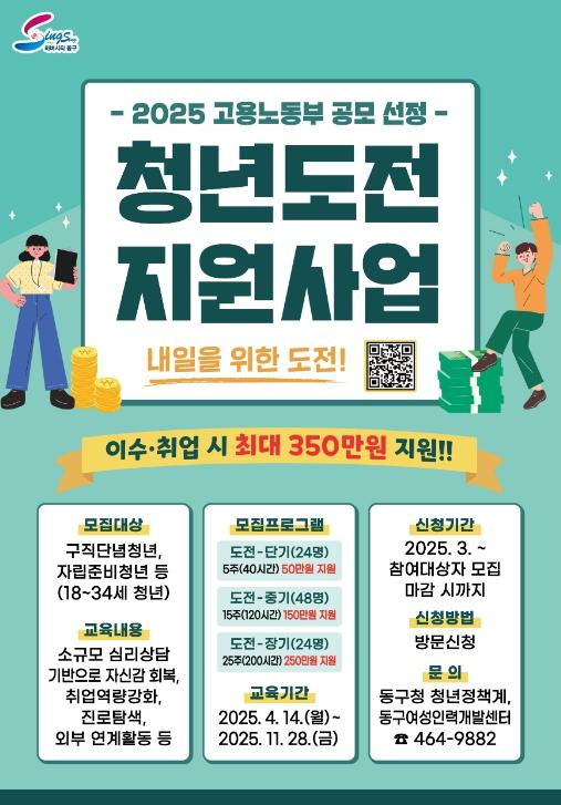 김진홍 동구청장은 “청년도전 지원 사업을 통해 구직을 단념한 청년들에게 맞춤형 프로그램을 제공해 취업 성공을 돕고 지역 청년들에게 활력을 불어넣겠다”라고 말했다.