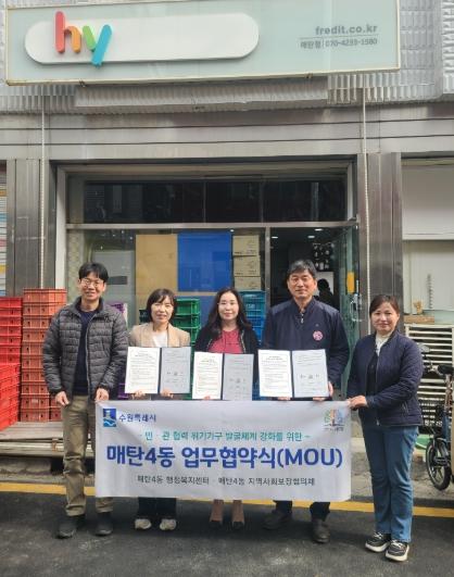 [종합뉴스채널, 최한솔기자] 수원시 영통구 매탄4동 행정복지센터와 지역사회보장협의체는 지난 25일 한국야쿠르트 매탄점과 지역기반 민·관협력 위기가구 발굴체계 강화를 위한 업무협약(MOU)을 체결했다.