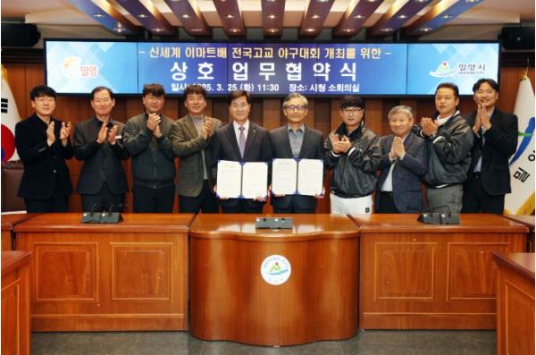 밀양시와 대한야구소프트볼협회는 대회 개최 전날인 25일 시청 소회의실에서 신세계 이마트배 전국고교 야구대회 개최를 위한 업무협약을 체결했다.