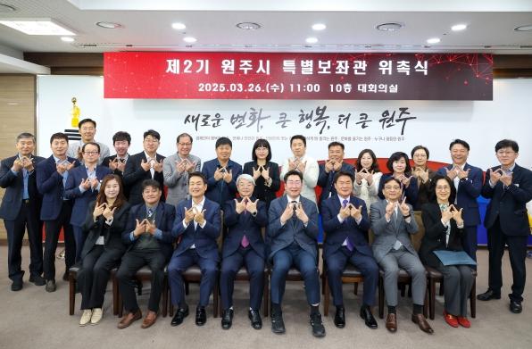 원강수 원주시장은 “새롭게 위촉된 제2기 특별보좌관들께서 분야별 전문성과 시정에 대한 열정으로 원주시의 발전과 시민이 만족하는 원주시를 만들기 위해 함께 고민해 주시길 당부드린다.”라고 말했다.