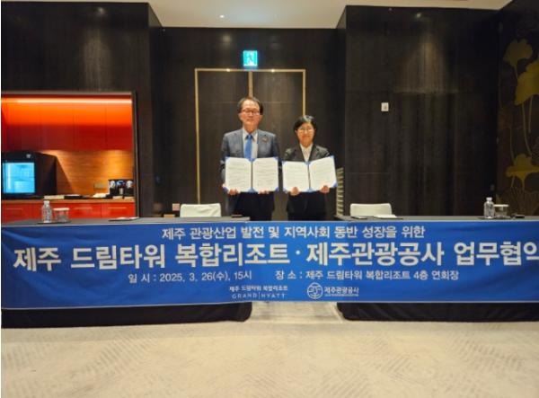 [종합뉴스채널, 홍희주기자] 제주관광공사는 26일 제주 드림타워 복합리조트에서 제주 드림타워(대표이사 회장 김기병)와 제주 관광산업 발전과 지역사회 공헌을 위한 업무협약(MOU)을 체결했다.