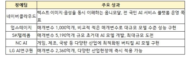 `25년 8월부터 「독자 AI 파운데이션 모델 프로젝트」 정예팀에 선발된 5개 팀이 치열한 경쟁을 통해 기술 혁신을 거듭한 결과, 정예팀이 개발한 AI 파운데이션 모델(`25년말 공개) 5개 모두 미국 비영리 AI연구기관 ‘Epoch AI’의 ‘주목할만한 AI모델(Notable AI Models)’로 등재되는 성과를 거두었다.
