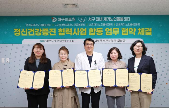 • [종합뉴스채널, 홍희주기자] 대구의료원은 서구 지역의 정신건강 고위험군을 조기 발견하고 적시에 의료·보건·복지 서비스를 통합적으로 제공받을 수 있도록 관내 재가노인돌봄센터 ▲정다운재가노인돌봄센터, ▲노인의전화재가노인돌봄센터, ▲보은재가노인돌봄센터, ▲샬롬재가노인돌봄센터와 합동 업무 협약 체결했다.