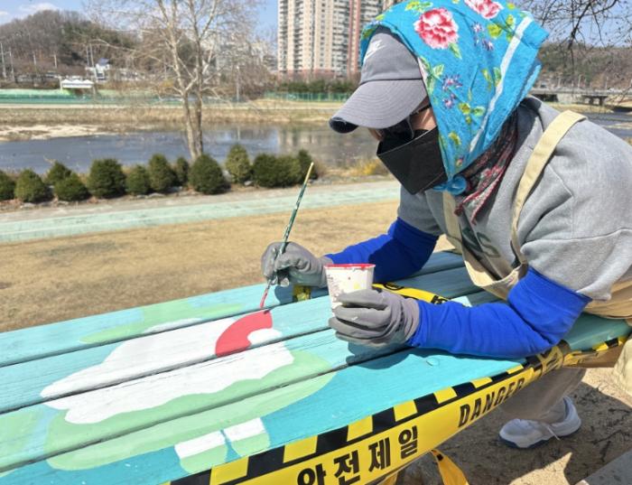 벤치 정비 작업은 ▶오염물질 제거를 위한 사포질 ▶페인트 접착력 향상을 위한 젯소 도포 ▶화사한 색감을 입히는 페인트 도색 ▶귀여운 캐릭터와 다양한 그림을 그리는 디자인 작업 ▶수성 코팅제로 마무리하는 작업 순으로 진행됐다.