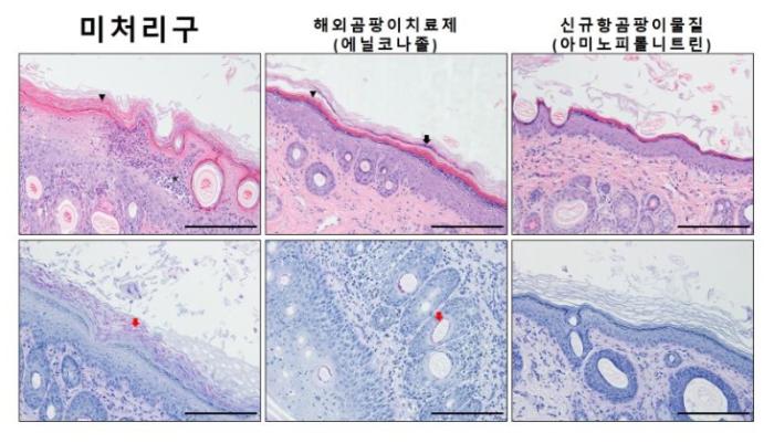 연구진은 수산 생물 자원인 곤쟁이 유래 미생물(Serratia grimesii)에서 항곰팡이 천연 소재인 아미노피롤니트린(APRN)을 발굴하고, 이를 곰팡이(트리코피톤 베르코숨)에 감염된 실험동물 피부에 도포했다. 그 결과, 곰팡이 감염으로 인한 피부 임상증상이 대조군 대비 70% 이상 개선됐으며, 조직 내 곰팡이 감염이 75% 억제됐다.